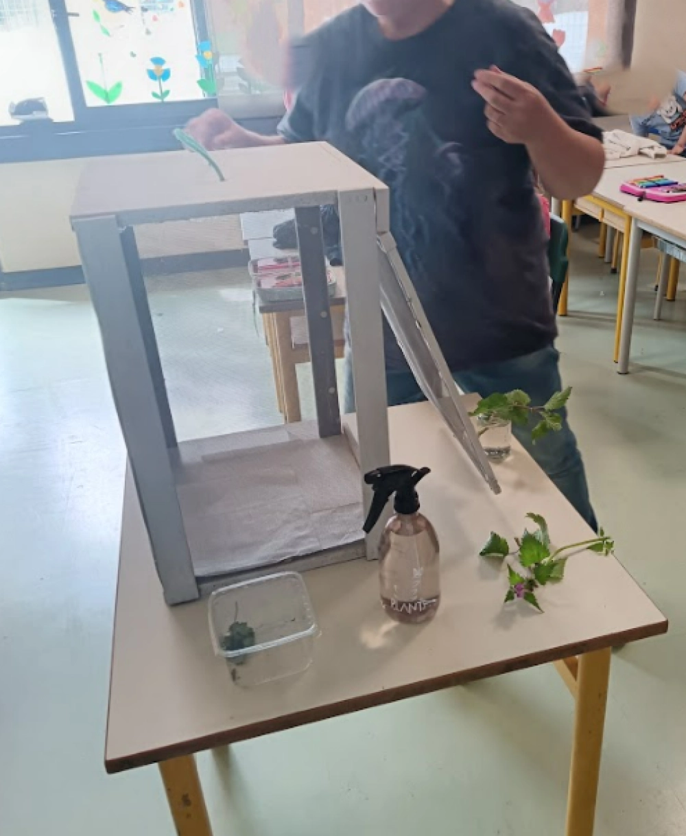 Con l'aiuto della nostra esperta abbiamo allestito le teche inserendo le ortiche, di cui i bruchi si nutrono.